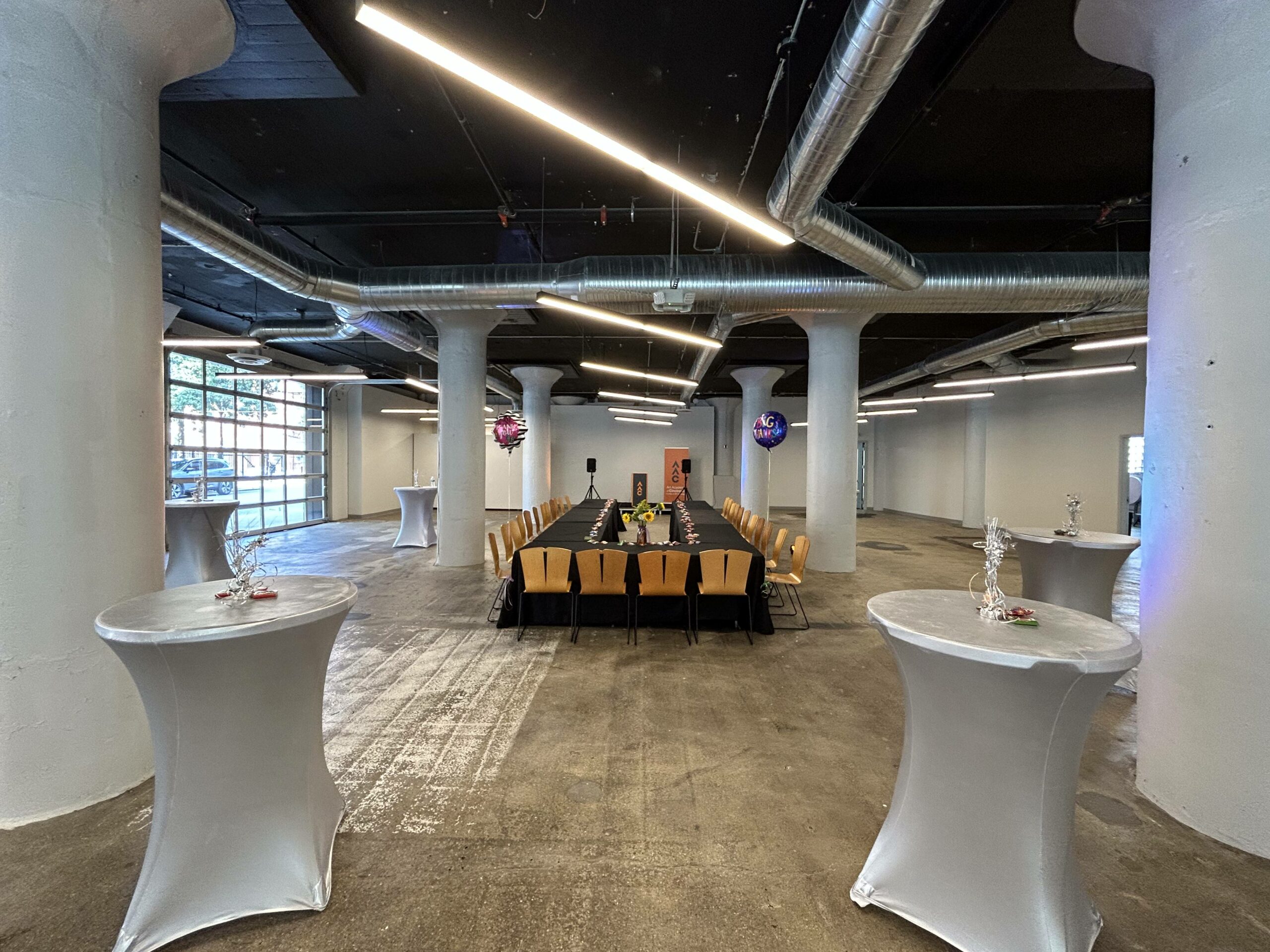 Our 6,000-square-foot open floor plan invites a 334-person capacity and features stunning windows, two operational glass garage doors, five movable walls, a private entrance, catering space, two gender-neutral restrooms, and is fully ADA accessible.